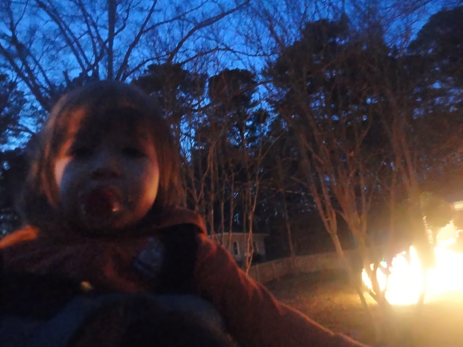 | That's Stan B's hand coming into the picture...his palm is up. He enjoyed looking at the lights and going for a walk in the backpack while it was dark out! |