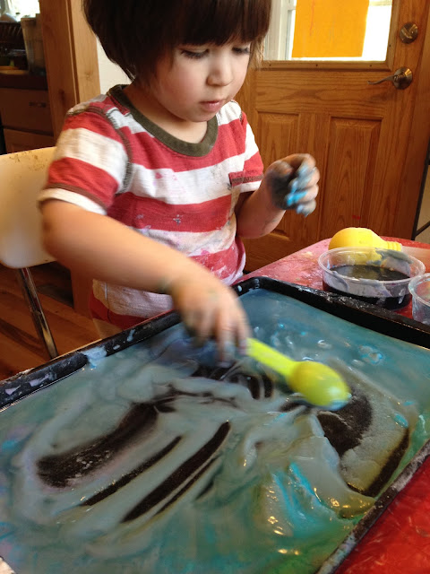 I gave him an eye dropper, a syringe and a baster. OH what fun he had. Lot's of fizzing and color mixing.